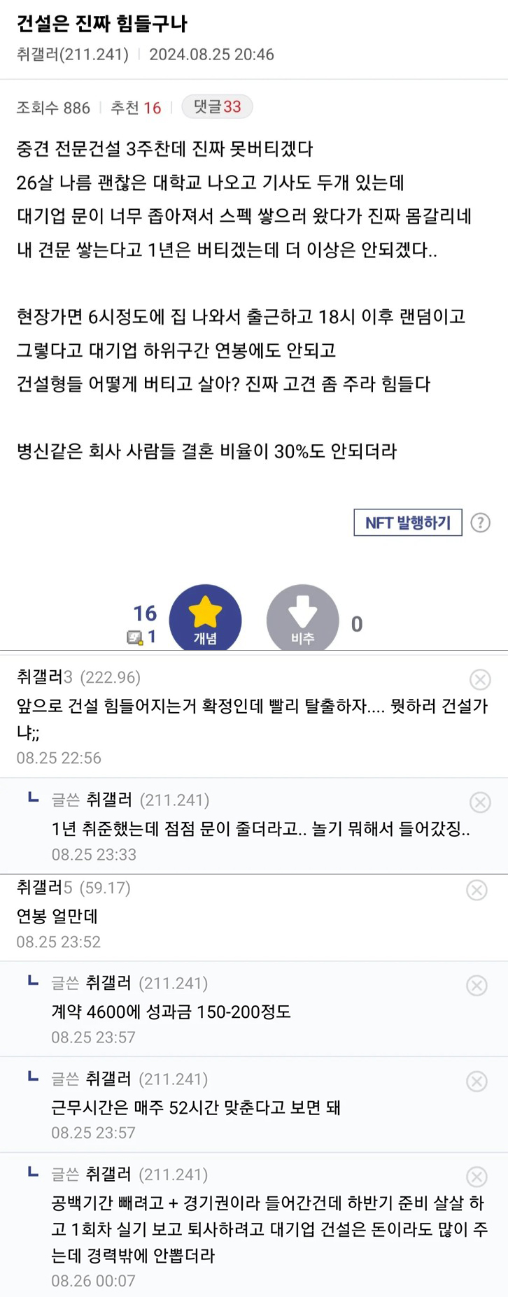 건설사 회사사람 결혼비율이 30%가 안된다...