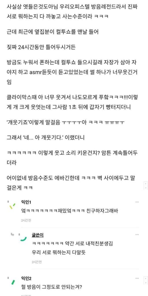 옆집남자 컬투쇼 듣는거 엿들었는데 그 분이 말 걸음ㅋㅋㅋㅋㅋㅋㅋ